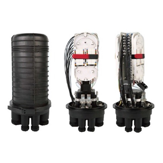 The kit consists of a plastic case, a metal shelf, a splice tray, a tray cover, sealing tape, sealing cord, and other accessories. It has two cable entrances at each end. The case can be sealed mechanically by compressing the sealing material.